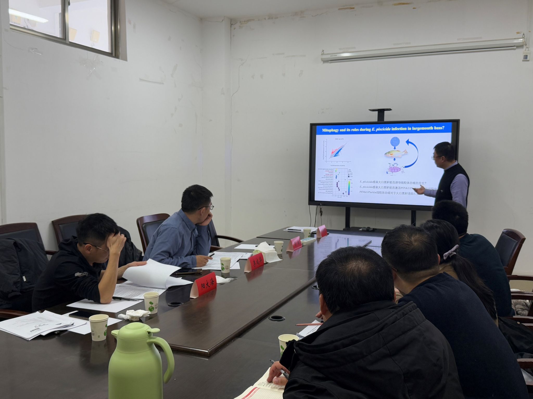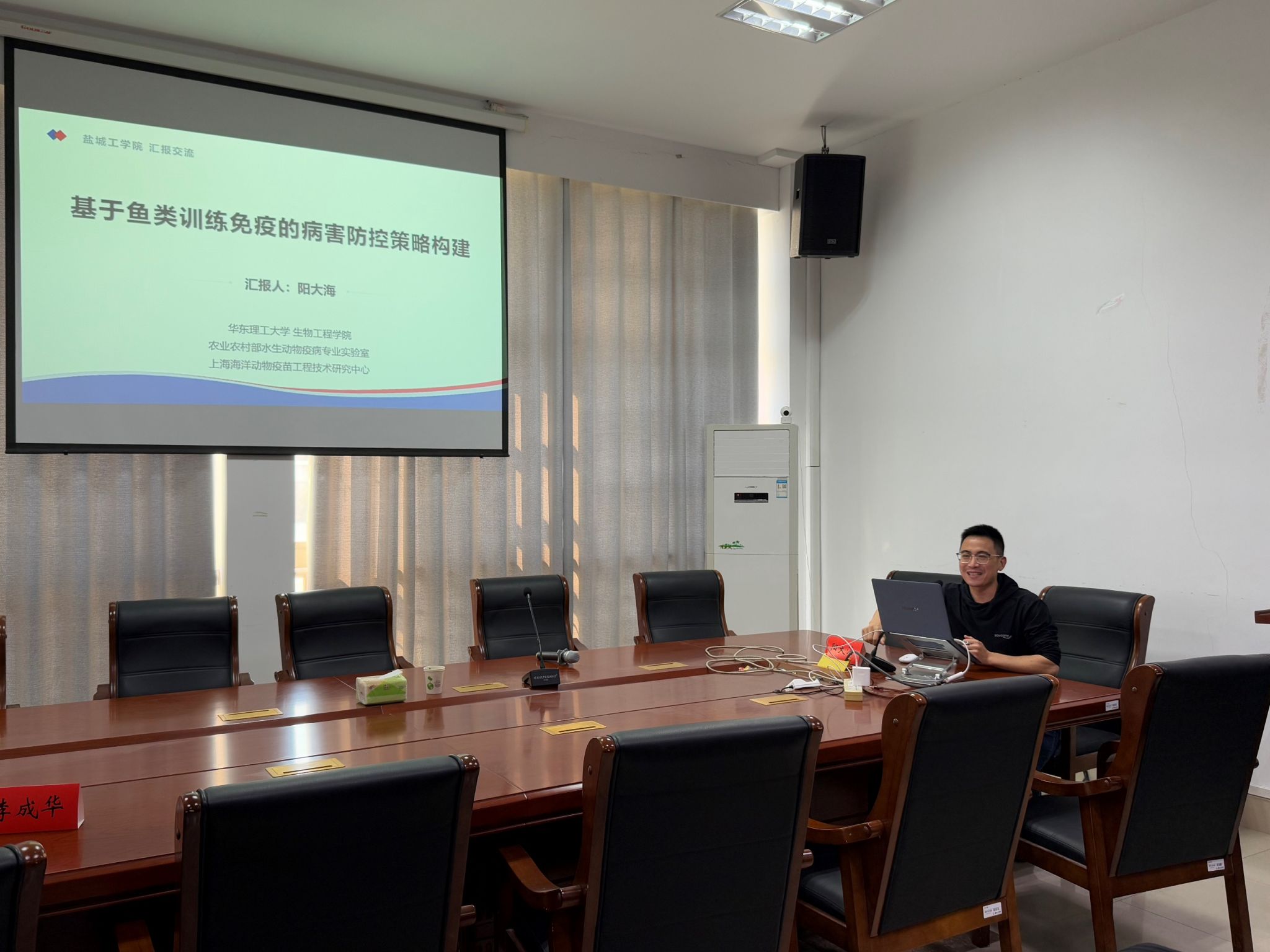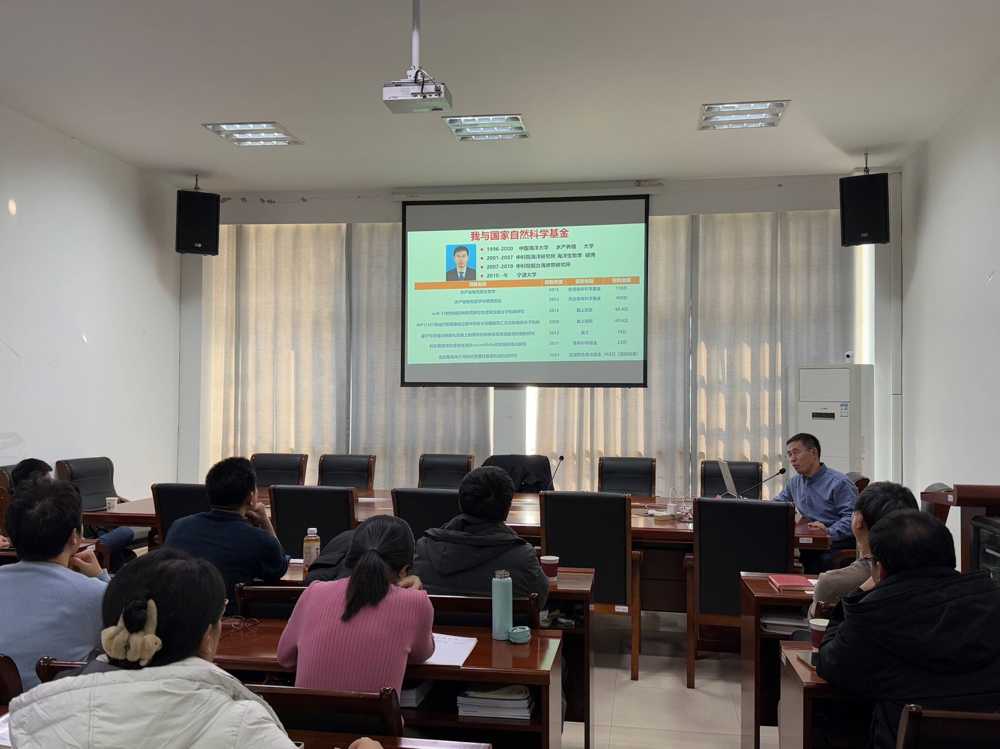当日下午2:30,在海生学院大会议室,李成华研究员和阳大海教授分别作《国家自然科学基金申请之我所见》、《基于鱼类训练免疫的病害防控策略构建》的学术报告。会议由院长彭斌主持,海生学院40余名师生参加。