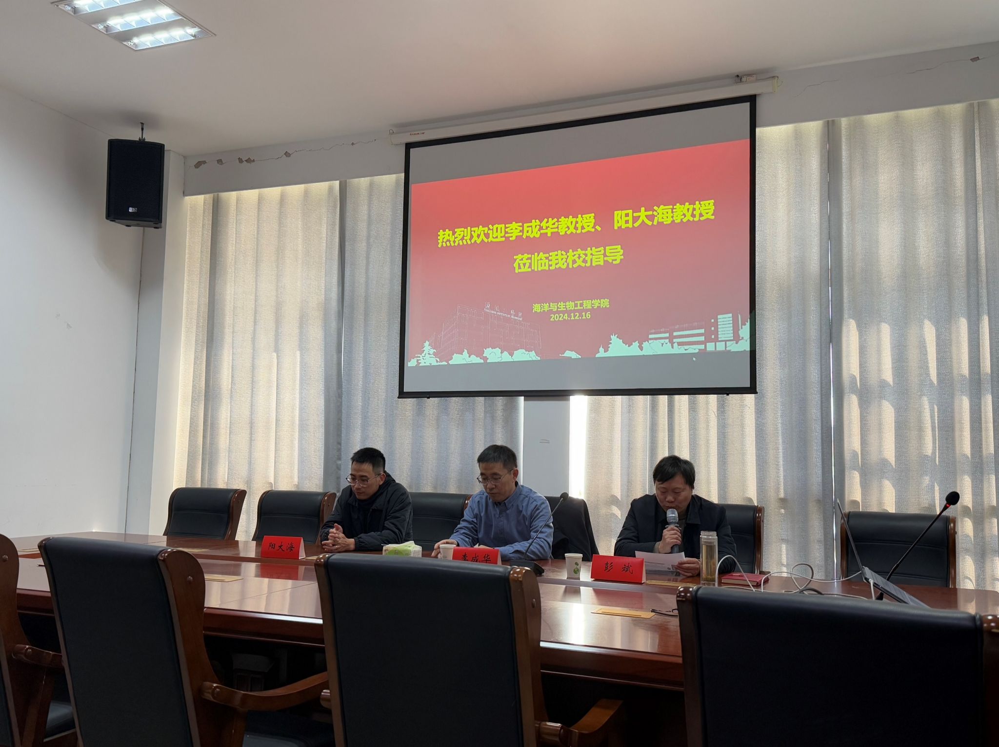2024年12月16日上午8:30,在海生学院小会议室,宁波大学李成华研究员、华东理工大学阳大海教授应邀为海生学院科研工作进行指导交流,会议由海生学院院长彭斌主持,副院长齐志涛和青年骨干教师参加。