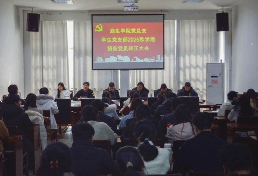2025年11月23日,海生学院学生党支部于大会议室召开了2025秋学期预备党员转正大会。党总支副书记孙新华、学工办主任郭海松、学生党支部书记霍福松、组织委员王晶晶、辅导员许璐及党支部全体成员参加,会议由学生党支部书记霍福松主持。
