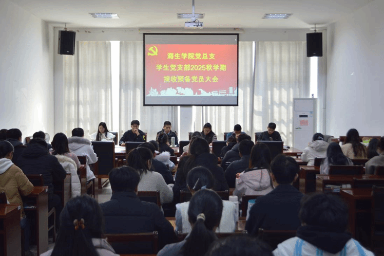 2025年12月10日,海生学院学生党支部在学院大会议室召开2025年秋学期接收预备党员大会。讨论发展对象杨卢嫣等11名同志的入党问题。党总支书记副书记孙新华、学工办主任郭海松、学生党支部书记霍福松、组织委员王晶晶、辅导员许璐和党支部全体成员参加,会议由霍福松主持。