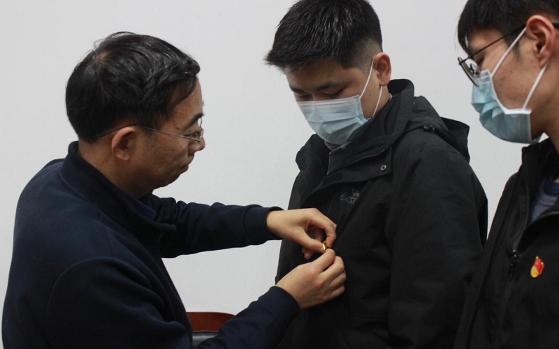 学院党总支书记高留才为预备党员佩戴党徽