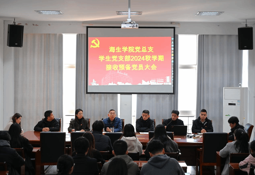 2024年11月23日,海生学院学生党支部于海生学院大会议室召开了2024秋学期接收预备党员大会,本次会议院党总支书记高留才、副书记孙新华、学工办主任郭海松、学生党支部书记霍福松、专职辅导员唐铭坤及党支部全体成员参加,会议由学生党支部书记霍福松主持。