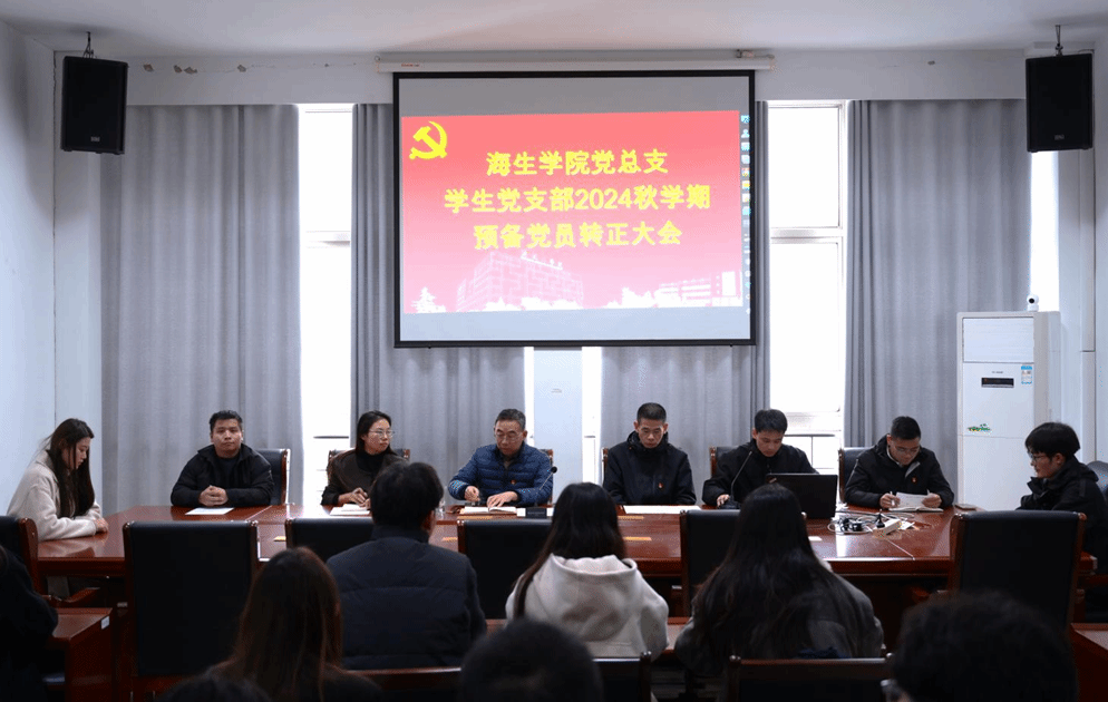 2024年11月23日,海生学院学生党支部在海生学院大会议室召开了2024秋学期预备党员转正大会,讨论周子会、王锦茵、陈怡悦、查志伟四位预备党员转正问题。党总支书记高留才、副书记孙新华、学工办主任郭海松、学生党支部书记霍福松、专职辅导员唐铭坤及党支部全体成员参加,会议由学生党支部书记霍福松主持。