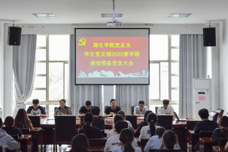 2025年5月30日,海生学院学生党支部在学院大会议室召开2025年春学期接收预备党员大会,讨论发展对象夏锦鹏等12名同志的入党问题。党总支书记高留才、副书记孙新华、学工办主任郭海松、学生党支部书记霍福松、组织委员王晶晶及党支部全体成员参加,会议由霍福松主持。