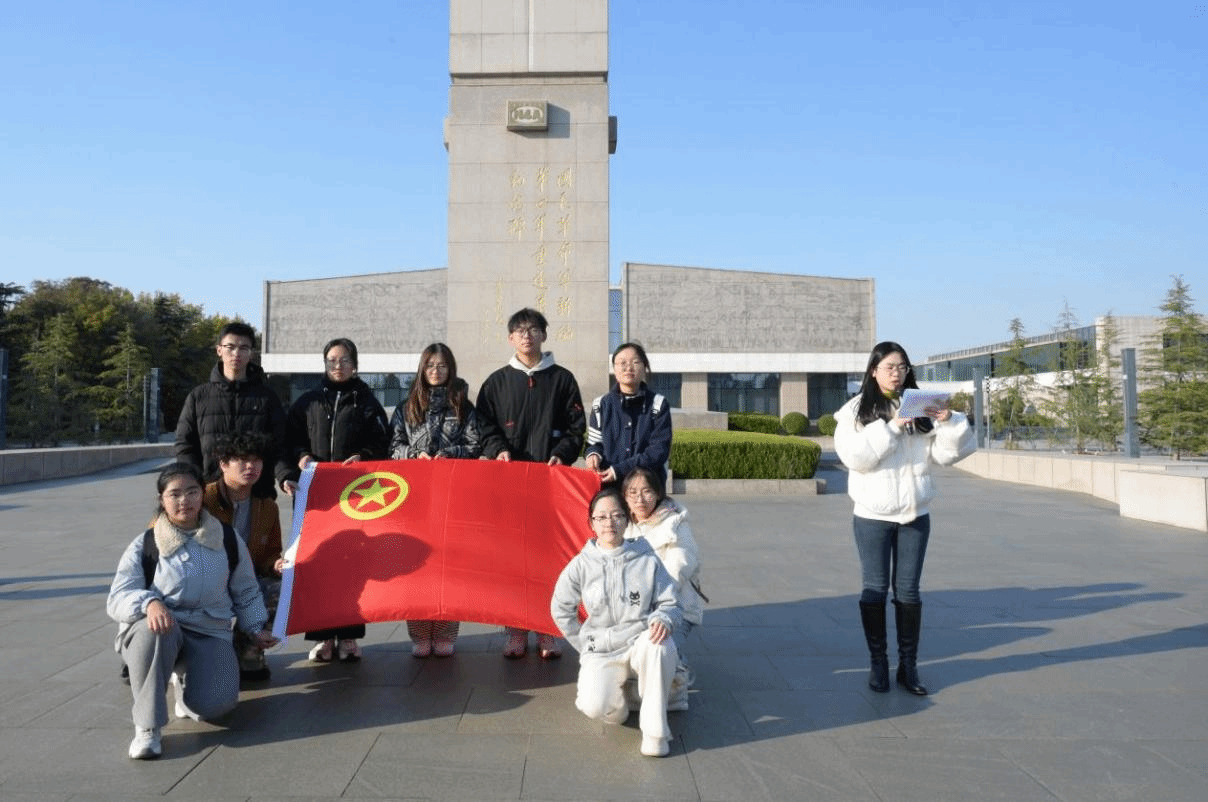 党总支书记高留才简要回顾了新四军在盐城的奋斗历史,纪念馆讲解员老师介绍了纪念馆的设立背景与展区布局。许璐带领同学们在纪念碑下入团宣誓。团员们右手紧握成拳、目光坚定,激昂的声音在纪念广场回荡。
