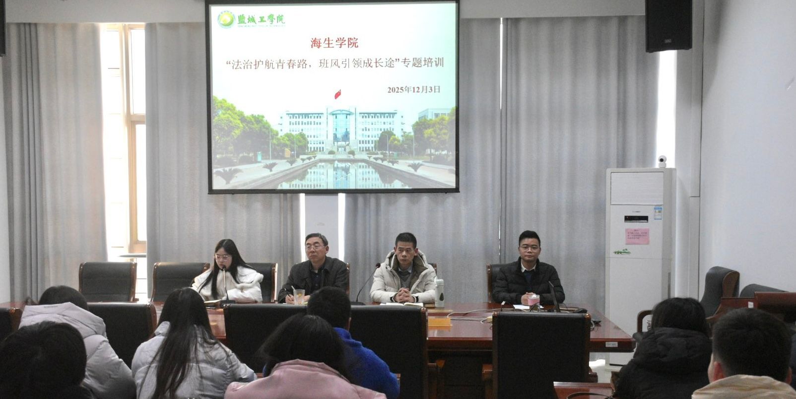 12月3日下午,海生学院在学院大会议室举办“法治护航青春路,班风引领成长途”专题培训。党总支书记高留才、党总支副书记孙新华、学工办主任郭海松、辅导员许璐出席,各班学生干部积极参与。
