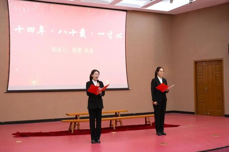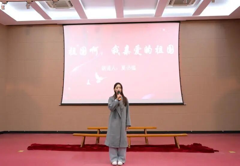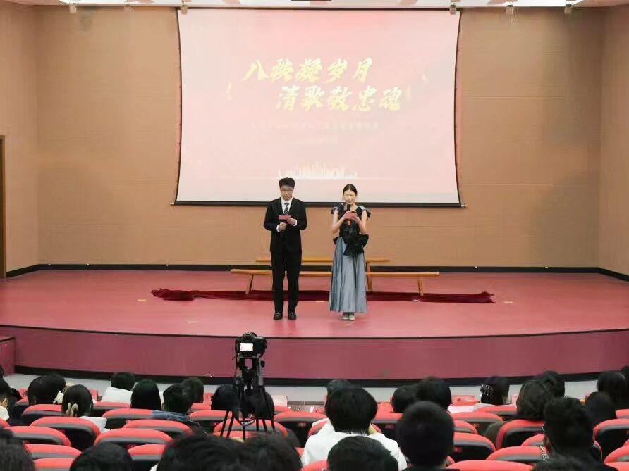 穿插的同学朗诵也是情真意切,《祖国啊,我亲爱的祖国》《十四年·八十载·一寸心》的演绎真挚动人,将爱国情怀化作具象的旋律与文字,表达了对祖国的无限热爱,更展现出新时代青年勇担使命、蓬勃向上的精神风貌。