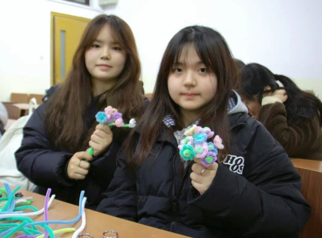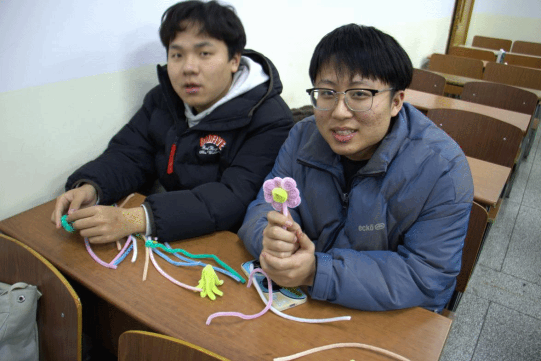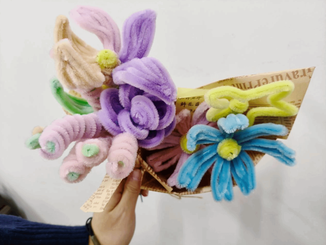 活动开始,大家选出心仪的颜色,将扭扭棒在指尖轻轻对折,再缓缓向内卷曲,捏出一片片圆润饱满的花瓣;随后反复弯折、缠绕、固定,将花瓣层层聚拢,勾勒出完整花形。原本朴素的扭扭棒,在一双双灵巧的小手中渐渐成型,化作一朵朵鲜活可爱的小花,在桌面上静静绽放。