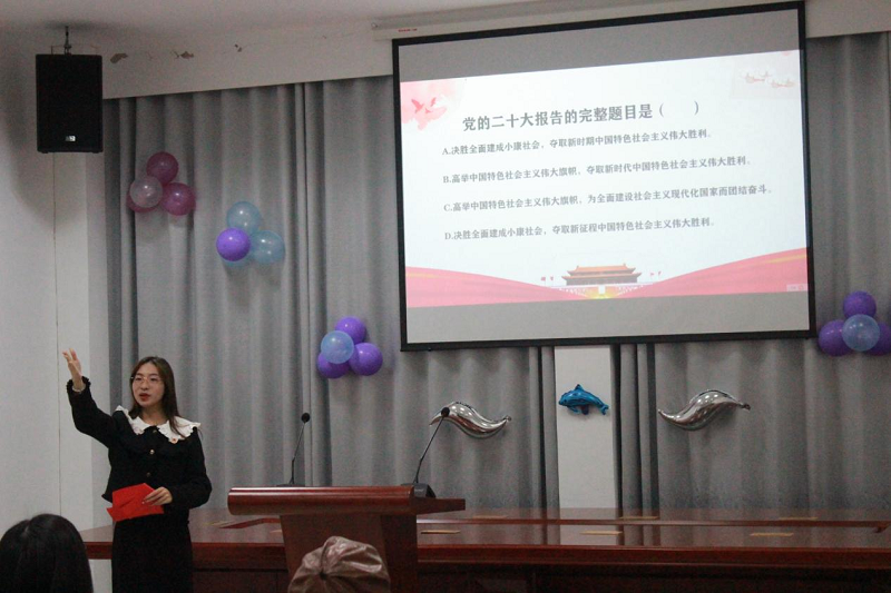 漫长的近代中国史,从参赛同学的朗诵声中,慢慢铺开,所有人都被带回到了那个艰难的岁月。朗诵小组一个一个登台,展现各自的别具风采,铮铮铁骨、浓浓柔情诉说着对共产党、对祖国的祝福与热爱,大家听完朗诵后都心潮澎湃、感慨万千。其中外国语学院吴雨婷同学带来的《不朽》饱含情感,真情流露出对英雄的礼赞;海生学院邵颖同学朗诵的《新时代新青年》,激励新时代青年要建功立业、志存高远,在青春赛道奋力奔跑。活动穿插着趣味小游戏,在场的同学们积极回答党的二十大相关题目,时刻关心二十大的相关信息,了解实时政事,立足中国、展望世界。