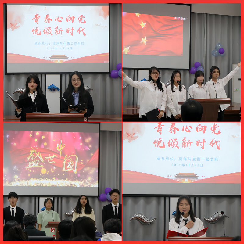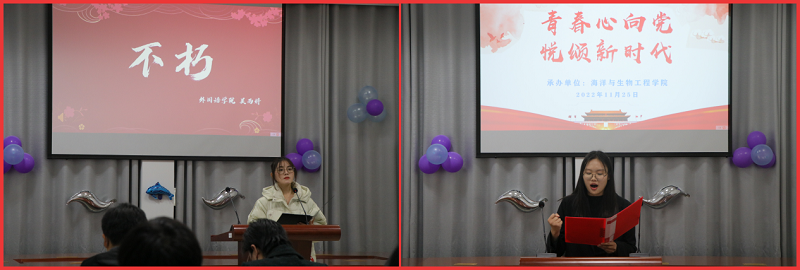 为了深入学习贯彻党的二十大精神,11月25日晚6:30,由校第二十七届校园文化艺术节组委会主办,海洋与生物工程学院承办的“青春心向党,悦领新时代”第五届朗诵比赛决赛在该学院大会议室举行。党办副主任魏巍、校办副主任陈桂香、组织部组织科科长王源、宣传部宣传科科长江莹、校团委挂职副书记兼化工学院学工办主任李慧等担任评委,海生学院党总支书记高留才、副书记毕蕾等60位同学参加。