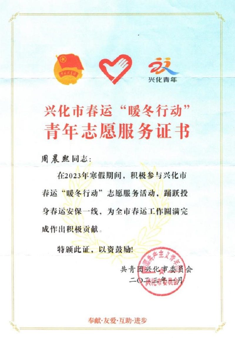其中,海生学院B生物222周晨熙同学积极响应号召,踊跃报名,通过线上报名登记的形式,参加了兴化市团委举行的2023年服务春运“暖冬行动”活动,参加了为期三天的客运站志愿活动,并在引导咨询,秩序维护春运志愿服务岗位上展现自我、奉献青春,