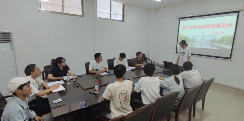 新时代赋予新使命,新时代书写新篇章。为选拔培养新一批新的学生干部,充分发挥学生自身的自主职能,海生学院于9月22日下午在小会议室开展学团联合会换届竞选工作。海生学院党总支书记高留才,党总支副书记毕蕾,学工办副主任郭海松,辅导员霍福松和唐铭坤参加。