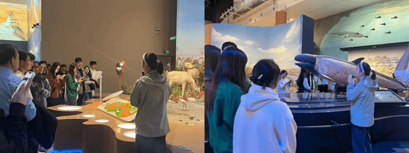 同学们参观了国际湿地、黄海生态区、候鸟迁徙栖息地及淤泥质海岸等内容,了解了盐城独特的湿地文化、绿色高效发展和丰富的生态资源。通过各类动植物标本和多样的主题景观的直观呈现,同学们懂得了更多的鸟类相关知识,明确了由南向北自国内江苏盐城黄海湿地至韩国顺天湾滩涂湿地等多个湿地的特色生物。其中特别讲述了盐城四宝:麋鹿、丹顶鹤、勺嘴鹬和朱鹮,分别详细介绍了这四种生物的外貌和习性。最令人瞩目的是屹立在展厅中央的抹香鲸骨架,据悉这是当地几年前发现的大型鲸鱼标本,极具科研和展示价值。此外博物馆还通过全息投影,沉浸式体验让同学们更直观地感受到盐城的大美风光和鸟类栖息停留时的画面。