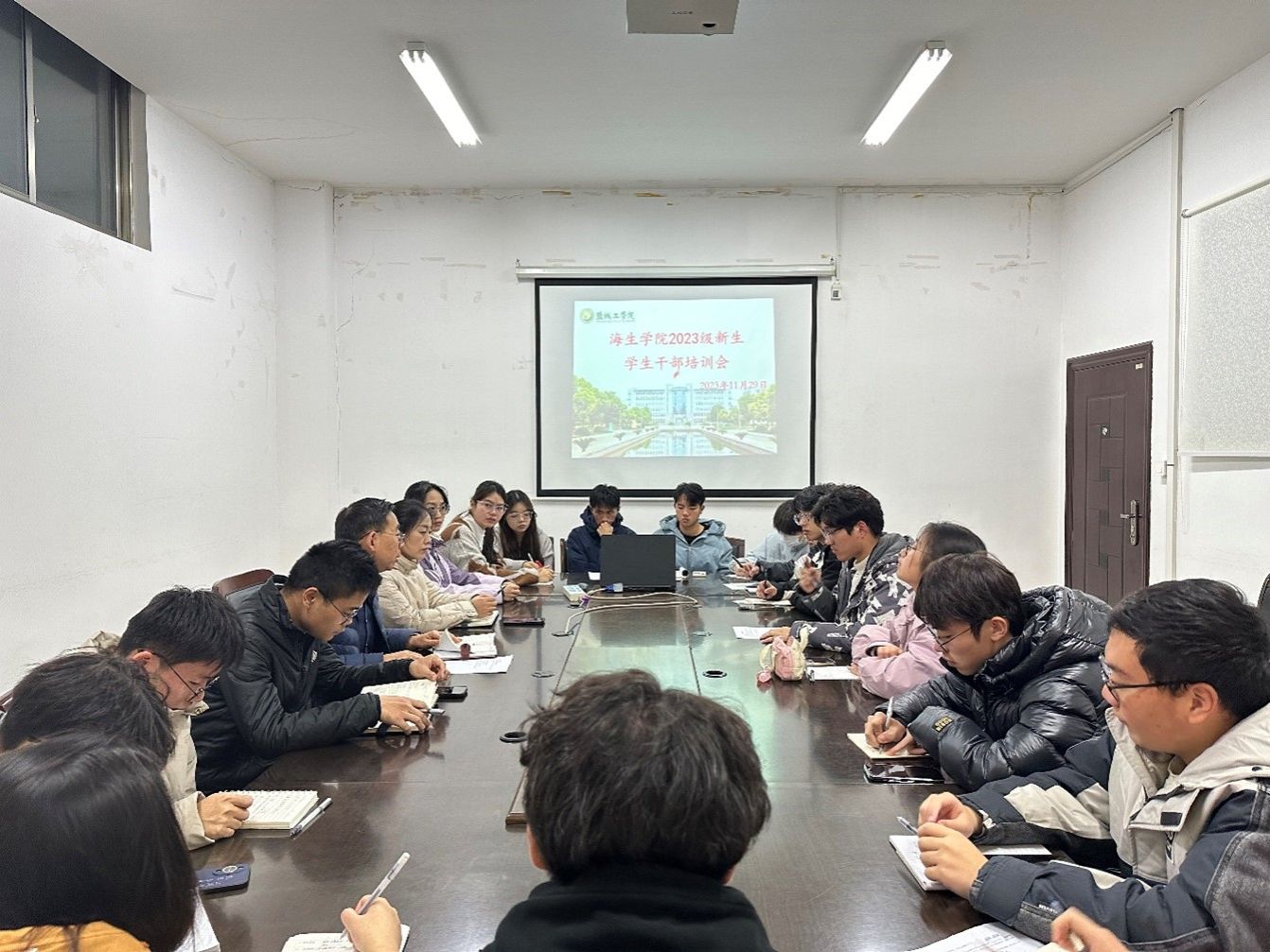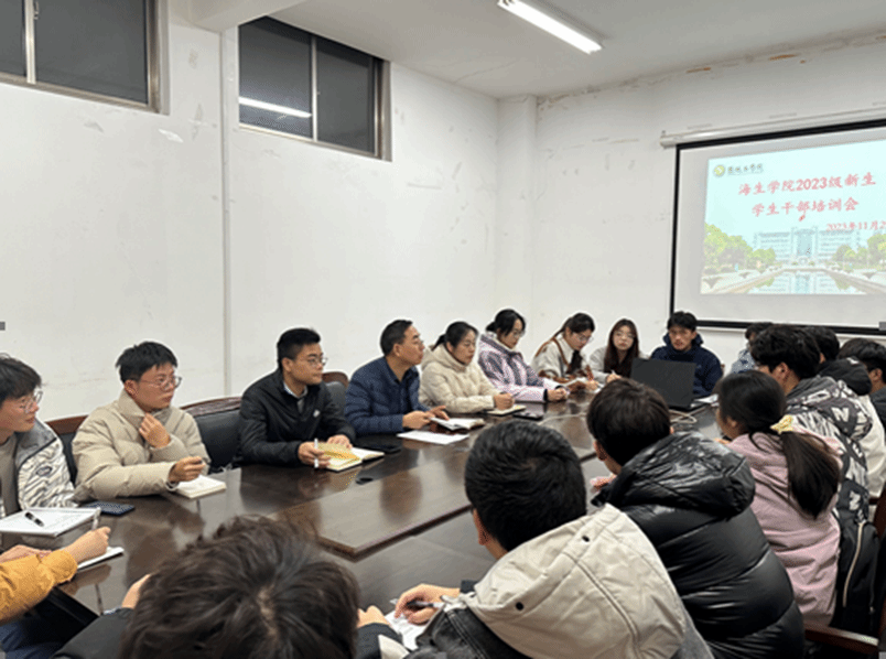 为了更好地做好学生干部的教育、管理和培养工作,切实提高学生干部的综合能力,进一步发挥学生干部模范作用,11月29日晚6:30,海生学院在会议室召开2023级新生干部培训会,2023级各班班长、团支书参加。学院党总支书记高留才、副书记毕蕾、学工办副主任郭海松、新生辅导员唐铭坤出席。