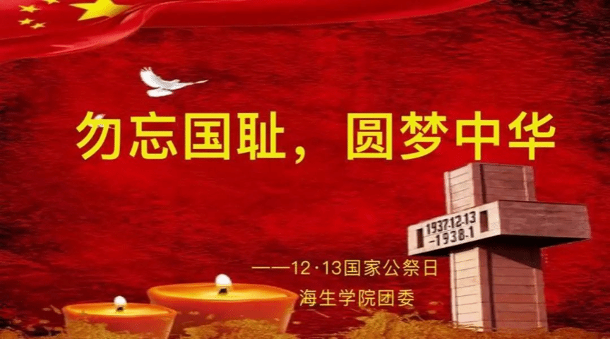 2023年12月13日是我国第十个国家公祭日。为贯彻落实中央精神,牢记侵略战争给中国人民和世界人民造成的深重灾难,进一步激发学生的爱国主义情怀,实现中华民族伟大复兴而不懈奋斗,海生学院团委和学生党支部开展了“勿忘国耻、圆梦中华”系列教育活动。
