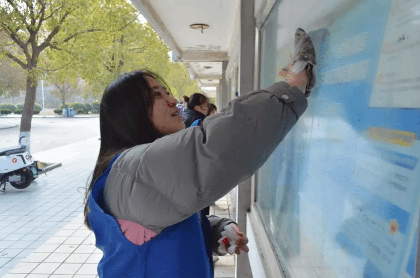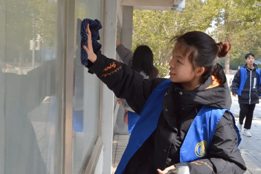 活动尾声,学生们来到知行楼书画长廊,擦拭历经数月寒冬侵袭的廊道玻璃。随着清水一遍遍擦拭,他们擦拭的不仅仅是布满灰尘的玻璃,更为绿美校园生态建设展现自己青春与活力,他们用勤劳的双手,为校园的环境改善贡献了自己的力量。
