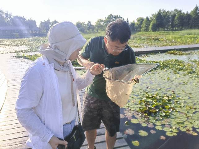 隋延鸣老师看到成群的鱼,对陈旭同学说到:“快!陈旭,赶紧捞,动作一定要快!”陈旭同学迅速的用抄网捞了一把,但是由于缺少经验,并没有捞到鱼。隋延鸣老师说:鱼的反应非常迅速,我们动作一定要很快才行。”之后,隋延鸣老师又给他们演示了一遍,终于捞到了鱼。隋延鸣老师捡起抄网里的两条鱼讲到,“这两种鱼和打火机一般大,具体识别青鳉鱼和食蚊鱼方法,是看它的背鳍,背鳍靠近尾鳍的,是青鳉鱼,而背鳍位于中间部位的则是食蚊鱼,另外,还有一个非常明显的特点是青鳉鱼的眼睛在光照下会发光。食蚊鱼和青鳉鱼作为湖泊生态系统中的重要组成部分,对维持水域生态平衡是非常重要的。