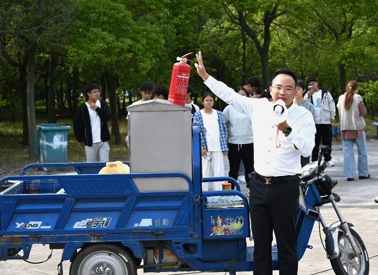 培训现场,陆亮通过实物演示,向新生们介绍了一系列重要的安全知识,特别是关于常见安全标识的认知以及火灾应对的基本技能。他详细讲解了干粉灭火器的部件与使用方法,还传授火灾逃生技巧,如弯腰捂口鼻、用湿毛巾防护等。他强调,室内灭火时,应背朝通道站立,以备紧急撤离。