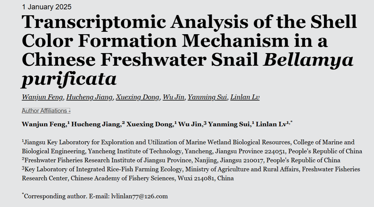 近日,海洋与生物工程学院Y23研究生冯婉君同学在《Journal of Shellfish Research》期刊上发表了一篇关于中国淡水螺——梨形环棱螺(Bellamya purificata)贝壳颜色形成机制的研究成果,该成果由盐城工学院海洋与生物工程学院吕林兰教授、隋延鸣副教授团队,江苏省淡水水产研究所姜虎成研究员及中国水产科学研究院淡水渔业研究中心金武副研究员合作完成。