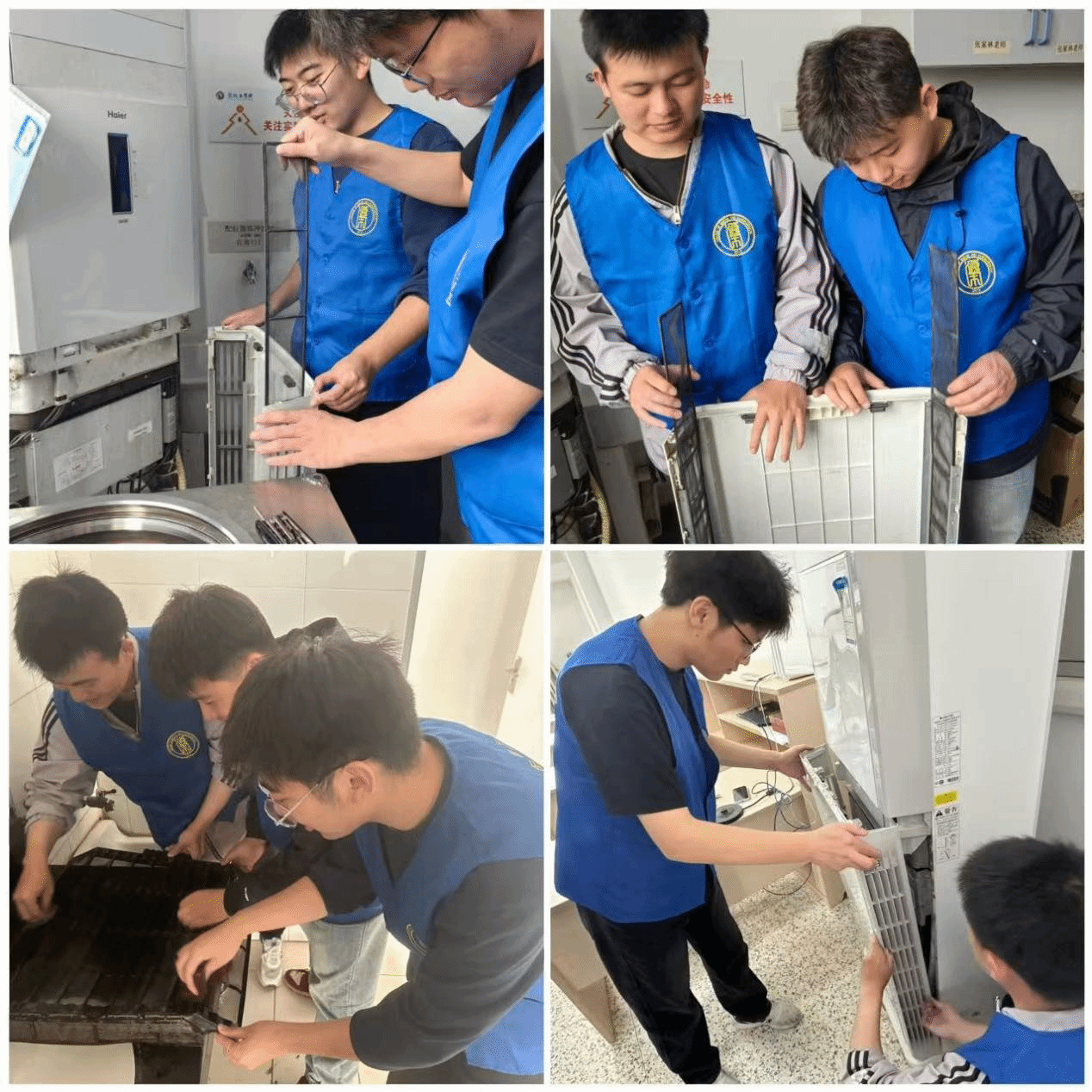 活动当天中午1:00,志愿者们在10号楼前集中,分发劳动用品。高留才发现大部分同学不会操作。他结合生活实际,向同学们讲解空调滤网的清洁方法,并贴心提醒:“近期天气多变,使用空调要适度,避免贪凉影响健康。”他强调,此次活动不仅是志愿服务,更是一堂生动的劳动教育课。“大家在擦拭灰尘的同时,也在传递彼此间的关怀,培养责任与担当。”随后分成27支小分队正式开启男女生宿舍、实验室空调清洗行动。