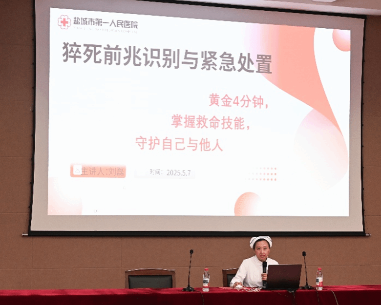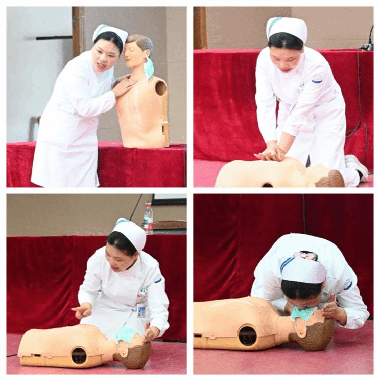 培训会上,刘磊护士长以“守护生命,急救先行”为主题,从猝死的征兆、心肺复苏、患者自救指南、健康生活方式、心理调适与我们能做什么进行一一解释。在心肺复苏教学环节,刘磊护士长先以通俗易懂的语言讲解理论要点,随后总带教许婷婷现场进行模拟演示,通过标准规范的动作,手把手教学,让师生们直观掌握心肺复苏操作要领。