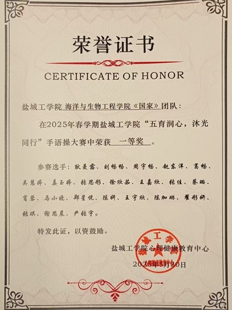 近日,由海洋与生物工程学院主办的“五育润心,沐光同行”大学生手语操大赛在在北校区五四报告厅成功举办。我院周宇畅、葛畅等同学表演的手语操《国家》荣获一等奖。