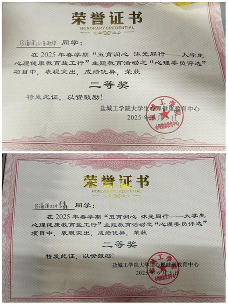 同时,在本次的校级心理委员评选上,我院同学同样取得良好成绩,B海洋221王雨烨同学、B海洋224李鑫同学荣获二等奖。