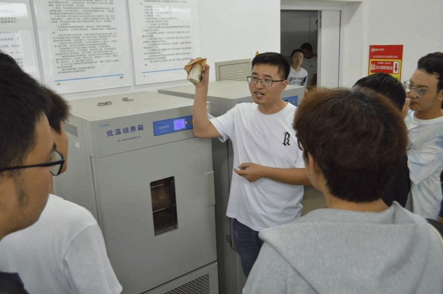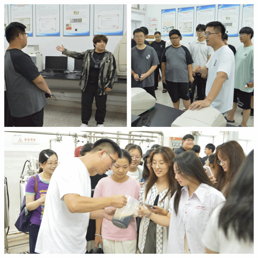 食品专业的教育活动在实验楼第五层开展,学院生物实验中心主任王笃军带领新生参观食品工艺学、发酵工艺学、啤酒中试实验室及大型仪器共享平台。在食品工艺学实验室,新生了解到果蔬、粮油、乳品等食品的加工实验流程;发酵工艺学实验室中,王笃军老师展示了自制酸奶;啤酒中试实验室里,他不仅讲解啤酒相关知识,还让新生品尝黄啤与黑啤,通过味觉体验深化认知。
