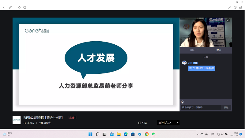 北京吉因加科技公司的人事部门负责人李经理,介绍了公司的发展历程、业务模式、技术体系、科研体系等基本信息,还邀请了学长学姐们分享自己的入职经历和工作心得。最后公司的人力资源部总监易萌介绍了“吉速计划培训”的人才培养体系,同学们提出自己的问题,易老师一一答复,最后发出了诚挚的邀请。
