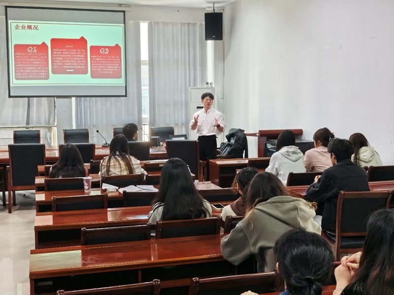 宣讲会上,公司代表借助PPT详细介绍企业概况。从2011年成立后的多个发展阶段,到旗下丰富的品牌矩阵,如胖哥家、南北小馆、又起楼等,还提及在全国100多个城市拥有450家直营门店及无锡占地20000平方米的现代化中央厨房、冷链物流体系等,让同学们对韩宴餐饮的实力与规模有了清晰认知。