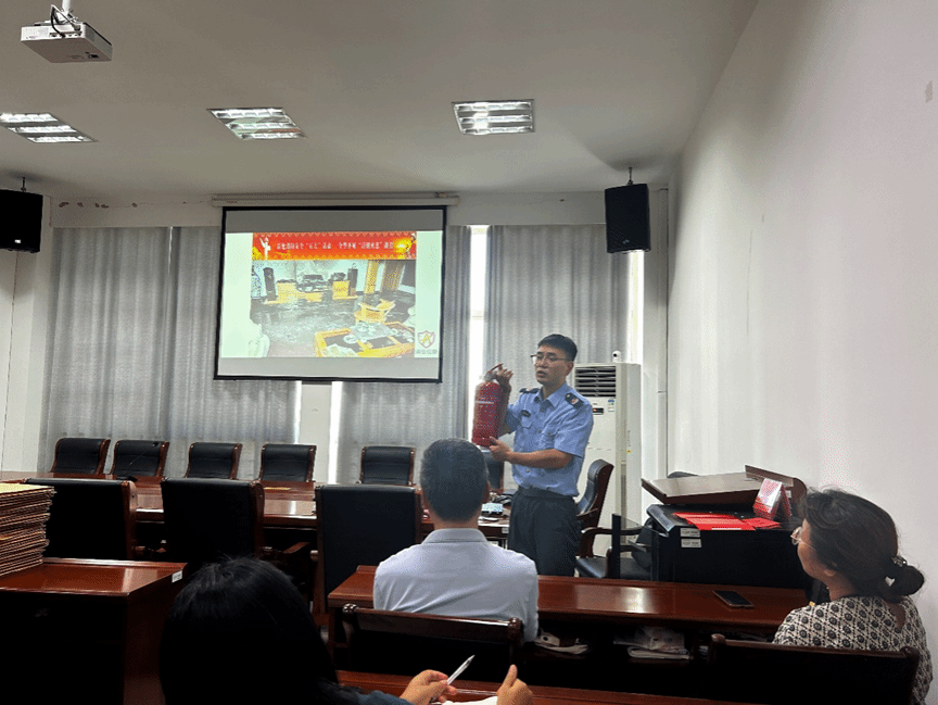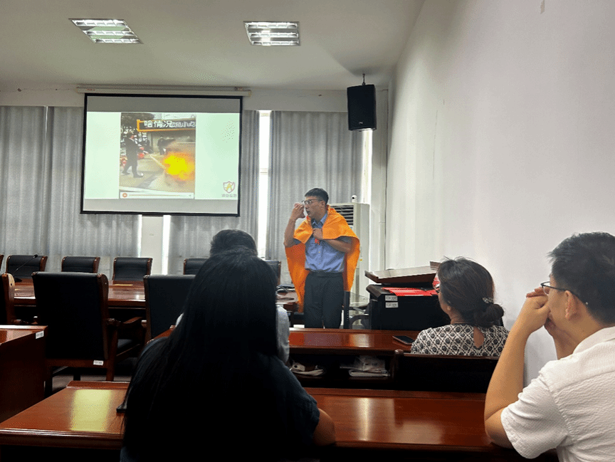 本次培训采案例讨论分析与模拟演练相结合的形式进行授课,严烽教员讲述了近年来发生的火灾情况,并选取代表性案例进行分析。他还向老师们演示了几种常用消防器材的使用方法,介绍了一些基本的火灾逃生技巧,如逃生时防烟手帕的折叠方式、灭火毯的使用技巧等。最后,严烽教员为老师们讲述了干粉灭火器和水基灭火器的使用方法及使用范围。