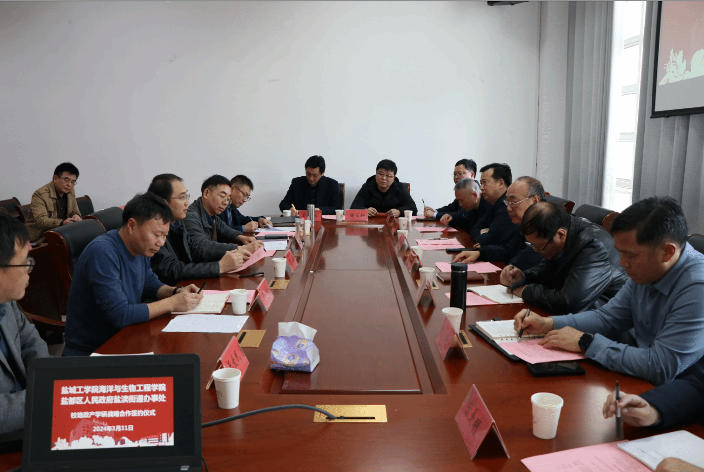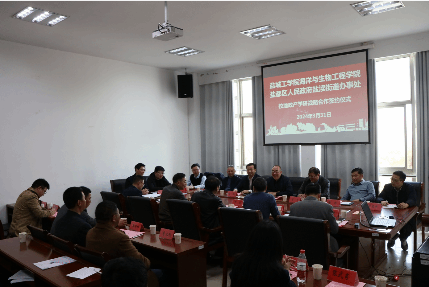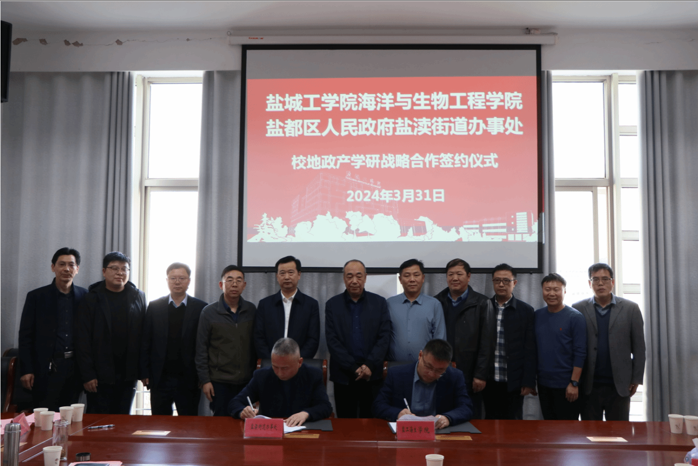3月31日下午,海洋与生物工程学院与盐都区盐渎街道办事处在北校区签订了战略合作协议。双方致力促进产学研深度融合,加快盐城特色渔业创新发展,助力乡村振兴、科技兴农,助推经济社会高质量发展。盐城市农业农村局渔业处处长陶其军、水产站站长李平、水产站书记张爱民、盐都区农业农村副局长陈明、水产站站长陈正轩,盐渎街道办事处主任任浩、副主任徐光明,盐城市上水环境生物公司董事长邵鹏,我校副校长丁成、海生学院院长彭斌、副院长齐志涛等出席。学院党总支书记高留才主持签约仪式。