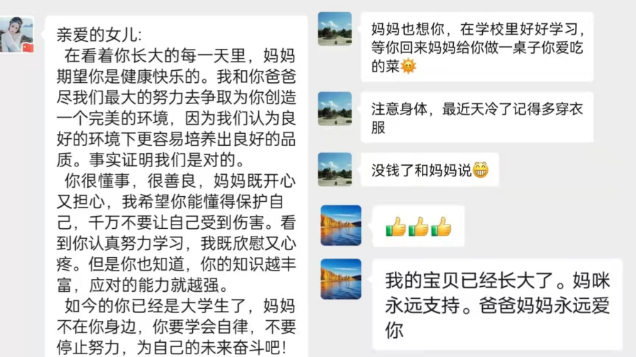这封家书,是学生们情感的烙印,也是生活中的闪光点。以前车马慢,书信也很慢,在慢慢的等待中寄予着写信人与收信人双倍的期待。这次,海生学院学子与家乡的亲人尺素传情,大段大段的文字于心中斟酌揣摩,许多平时口头无法表述的感情伴随写信时内心的波澜起伏落在笔尖。B海洋213王锦茵同学写信时脸上泛起了幸福的微笑,她说:“平时是不可能张口对父母表达爱意的,这一次痛痛快快地写在了信里。”B食品211彭冰洁也表示:“我是家中最小的孩子,写这样的一封家书,能给家中疼爱我的父母寄去爱和温暖,我很期待看到他们收到信的表情。”