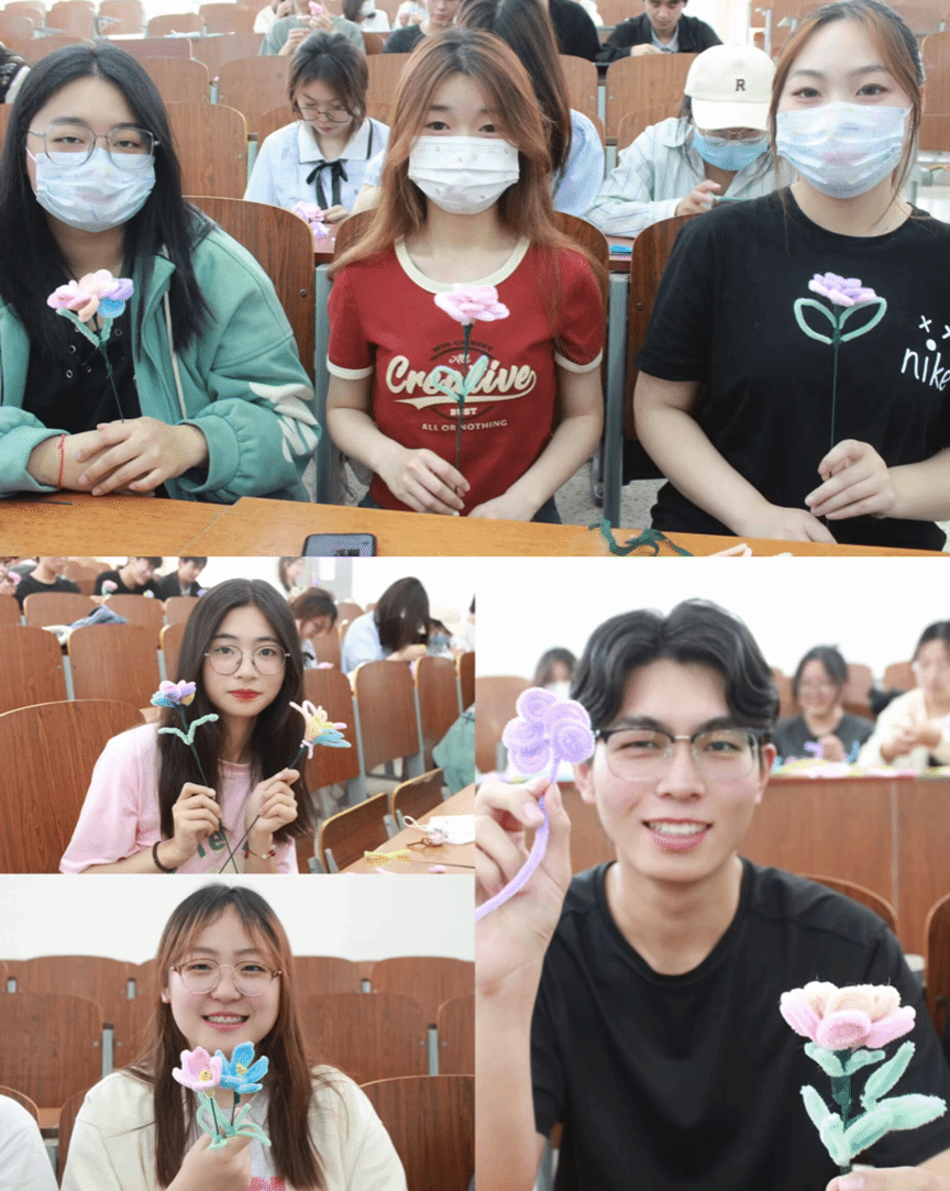 海生学院的学子们一个个化身心灵手巧的艺术家,将自己对母亲的爱充分的展现出来,制作着属于他们自己的独一无二的花。母亲是我们人生中很重要的人物,她给予了我们生命,抚养我们长大。B海洋222班的王淼同学说道:“今天我很荣幸参与了送母亲一束花的活动,虽然活动过程不足两小时,但制作过程中同学们脸上洋溢的笑容还是让我真切感受到大家对妈妈的爱,母亲节虽然只是五月的一天,但母亲的爱却是岁岁年年~看到每个同学制作完后都第一时间发给了妈妈,收到妈妈的夸奖后都露出了幸福的笑容,我想这就是这次活动举办最大的意义。”