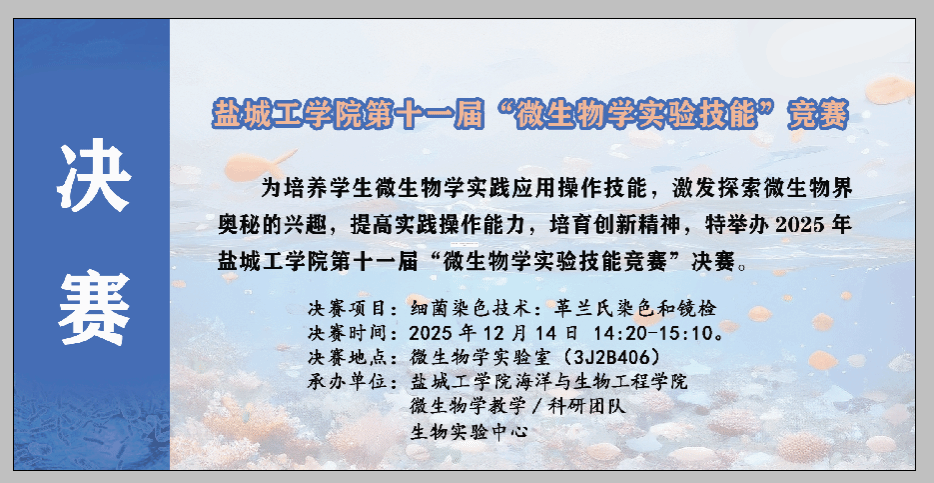 2025年11月26日至12月14日,海生学院微生物教学科研团队和生物实验中心联合承办盐城工学院第十一届微生物学实验技能竞赛。“微生物学实验技能竞赛”作为面向全校学生的重要生物大类学科竞赛,旨在激发学生探索微生物界奥秘的兴趣,夯实微生物实践操作基本功,培育严谨科研态度,培养学生创新精神。
