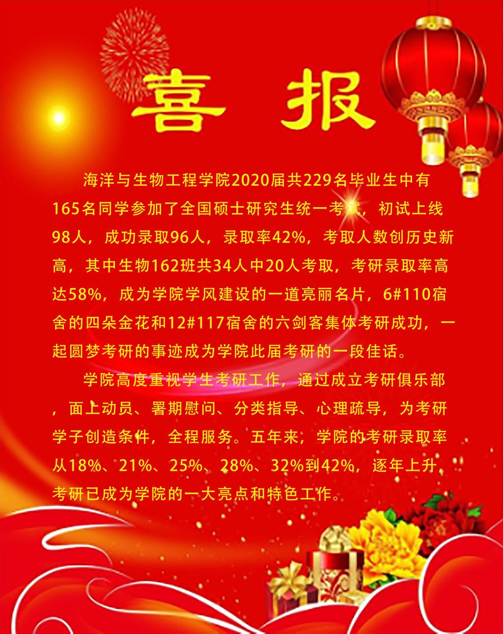 海洋与生物工程学院2020届共229名毕业生中有165名同学参加了全国硕士研究生统一考试,初试上线98人,成功录取96人,录取率42%,考取人数创历史新高,其中生物162班共34人中20人考取,考研录取率高达58%,成为学院学风建设的一道亮丽名片,6#110宿舍的四朵金花和12#117宿舍的六剑客集体考研成功,一起圆梦考研的事迹成为学院此届考研的一段佳话。