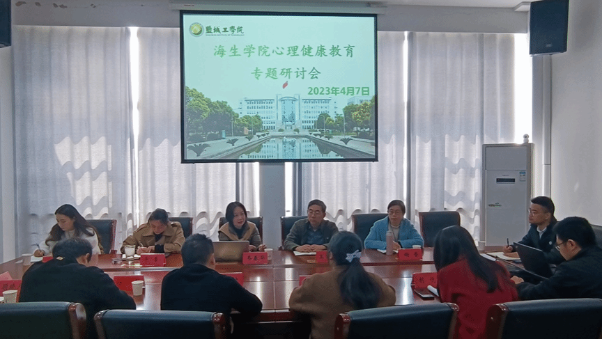 海生学院于2023年4月7日召开心理健康教育专题研讨会,心理健康教育中心主任韦春华带领中心专职教师谢莹、学生处朱倩晨前来调研,海生学院党总支书记高留才、副书记毕蕾、学工办副主任郭海松以及所有专兼职辅导员参会。