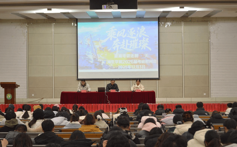 为激励考研学子冲刺迎考、缓解备考焦虑,12月3日晚,海生学院在北校区化工楼报告厅举办“乘风逐浪 奔赴璀璨”2026届考研慰问活动。学院党总支书记高留才、副院长张丽、副书记孙新华出席活动,学工办主任郭海松,辅导员顾晓天、霍福松、许璐,全体2026届考研学子及全体大一学生参加。