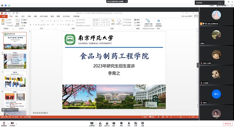 5月18日晚,南京师范大学食品与制药工程学院的博士、副教授李昺之老师受邀为我院2023届考研学生开展线上招生宣讲,学院学生40余人参加。