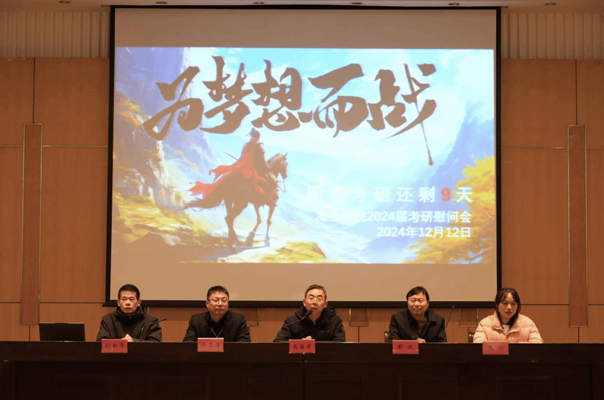 为鼓舞考研学子士气,缓解考前压力,坚定应考信心,12月12日晚,海生学院在图书馆报告厅举办“为梦想而战”2025届考研慰问活动。党总支书记高留才主持,院长彭斌,副院长齐志涛、张丽,副书记孙新华出席活动,学工办负责同志、毕业班辅导员及学院2025届考研学生参加。