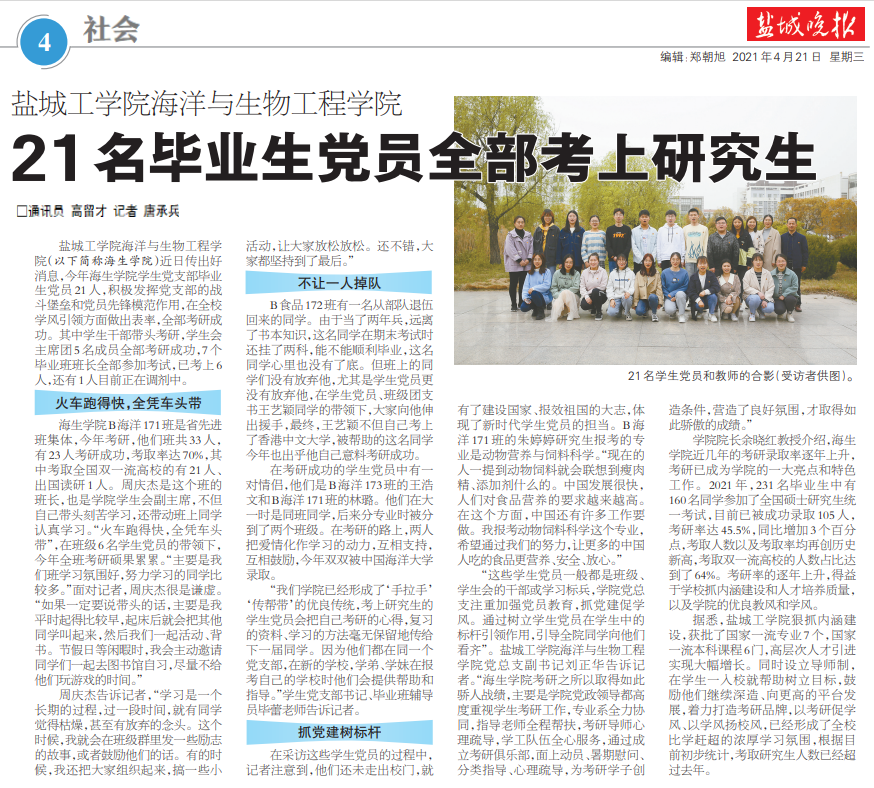 海洋与生物工程学院在党建、学生考研、师资队伍、学科建设和科研创新等方面亮点纷呈,连续三年获评校“先进集体”,学院连续六年获得“考研就业双先进”。近几年来,学院毕业生考取研究生率达40%以上。
