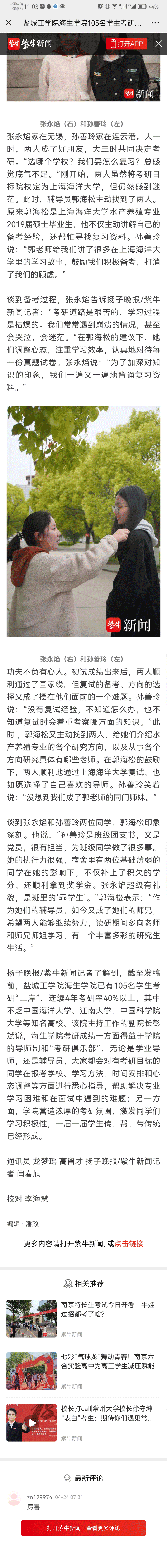 4月23日,扬子晚报/紫牛新闻记者从盐城工学院海生学院获悉,该院至今为止已有105名学生考研成功。巧合的是,海生学院B海洋193班的张永焰和孙善玲两位同学成功被上海海洋大学水产养殖专业拟录取。她们既是同班同学,又是室友,还意外成了辅导员老师的师妹。孙善玲告诉扬子晚报/紫牛新闻记者:“感谢辅导员对我们鼓励和帮助,让我们得以安心备考。也感谢学院给我们提供了良好的学习环境,让我们在备考期间无后顾之忧。”
