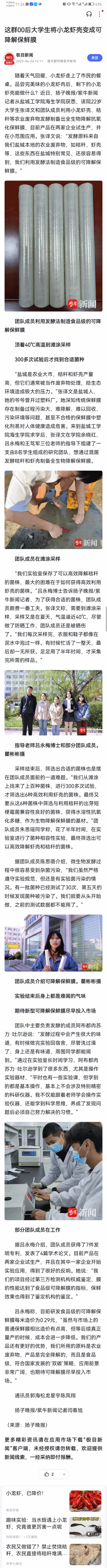随着天气回暖,小龙虾走上了市民的餐桌。品尝完美味的小龙虾肉后,剩下的小龙虾壳能做什么?近日,扬子晚报/紫牛新闻记者从盐城工学院海生学院获悉,该院22岁大学生张译文和团队成员利用小龙虾壳、秸秆等农业废弃物发酵制备出全生物降解抗氧化保鲜膜,目前产品在两家企业试生产,并在小范围应用。张译文说:“发酵原料来自我们盐城本地的农业废弃物,如秸秆、虾壳等,这些东西在盐城特别常见,还很容易得到,我们利用发酵法制造食品级的可降解保鲜膜。”